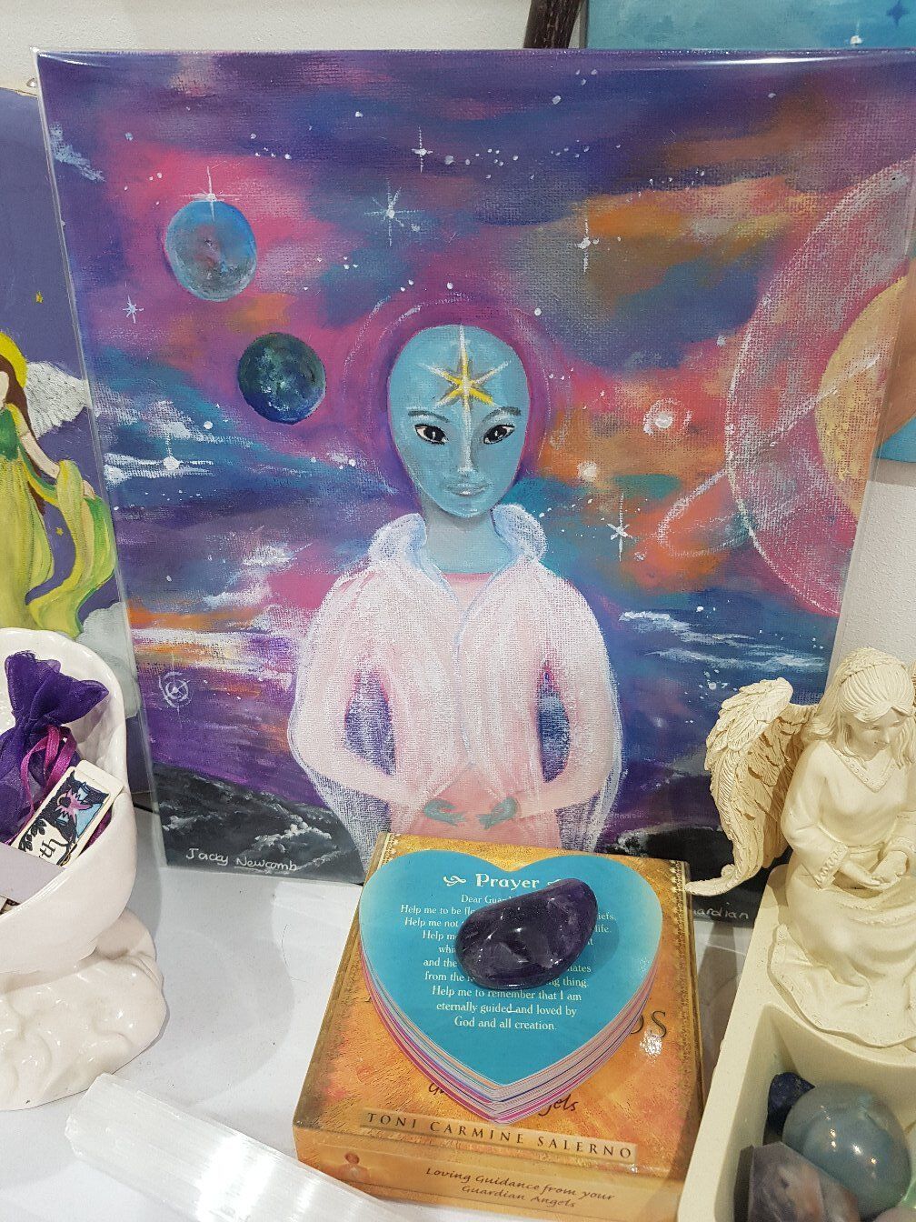 Jacky started painting again in 2016 after a break of many years. Living by the sea in Cornwall, the first pieces were of waves and watery scenes, some of which went to local galleries. However, she soon felt drawn to paint angels, spirit guides and spirit animals, as well as a wide range of spiritual art including star beings!
